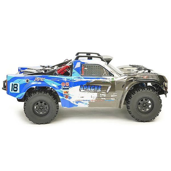 Le FTX Apache Trophy Truck est propulsé par quatre roues motrices. Il est alimenté par une batterie Li-Po en 3S contrôlée par un variateur de vitesse Hobbywing 50A et un moteur brushless en 2500kv. Le FTX Apache offre des sensations fortes à grande vitesse en tout-terrain. La suspension à rotule ajustable offre une polyvalence maximale, tandis que les cardans de transmission type CVA à l'avant et les différentiels en pignons métal à l'avant et à l'arrière, garantissent une fiabilité optimale. Sur le plan esthétique, la carrosserie semi-échelle élégante de l'Apache Trophy Truck est agrémentée de graphismes percutants, disponible en bleu ou en rouge, complétée par un éclairage à LED et une bavette avant. Cette voiture RC est équipée de pneus type course montés sur des jantes noires à huit branches. Le kit est livré complet avec batterie, chargeur et sac de protection pour la batterie Li-Po.