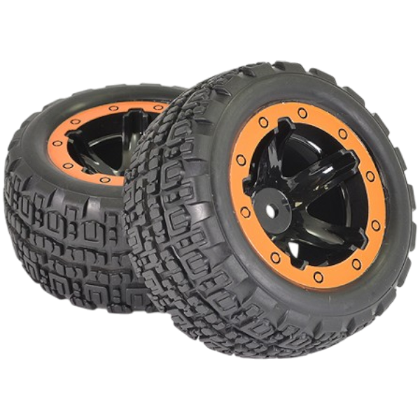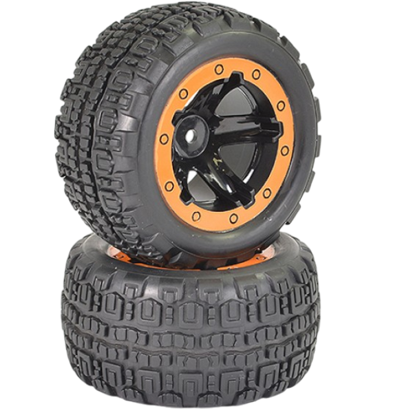 Jeu de deux pneus collés sur jantes orange pour FTX Monst truck.
