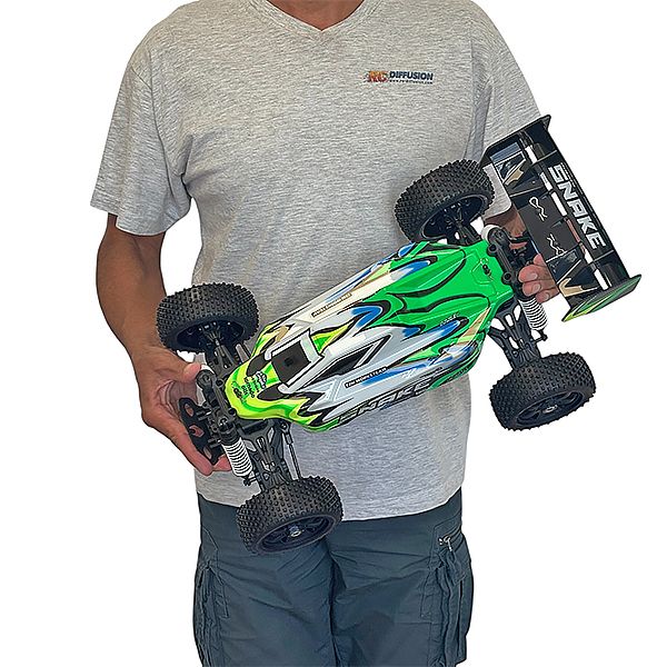 Voiture RC électrique pour la pratique du modélisme en tout terrain : quatre roues motrices, quatre amortisseurs hydrauliques en alu, moteur électrique très puissant type "brushless", télécommande à volant en 2.4 GHz avec limitation de la vitesse maximum.
