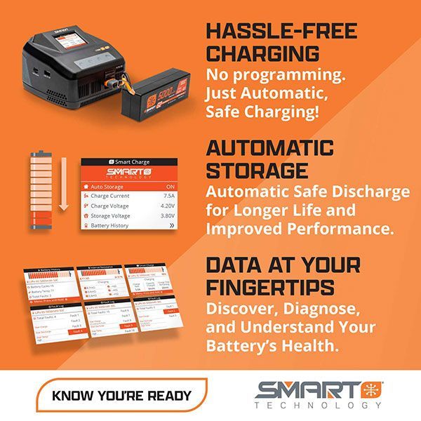 Comme pour les autres batteries Smart, vous n'aurez jamais besoin de configurer vos préférences de charge pour une batterie Spektrum™ Smart G2, sauf si vous le souhaitez. Lorsqu'une batterie LiPo Smart G2 est connectée à un chargeur Spektrum™ Smart, ses paramètres de charge uniques et ses informations de santé sont transférés au chargeur depuis la puce mémoire intégrée de la batterie. Vous pouvez ensuite consulter et définir des préférences telles que le courant de charge via le chargeur. Il vous suffit donc de connecter la batterie à votre chargeur Smart pour la charger. La technologie Smart se charge du reste.