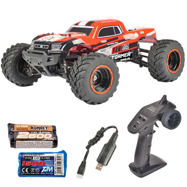 Ce truck tout terrain 1/10 électrique 4WD prêt à rouler se caractérise par ses nombreux équipements de qualité pour une fiabilité et des performances optimales. Son robuste châssis, son puissant moteur type 390, sa transmission entièrement sur roulements à billes avec deux différentiels à pignons et cardan central en acier traité, ses suspensions avec amortisseurs hydrauliques et ses pneus surdimensionnés lui permettent de se jouer à grande vitesse des pièges du terrain. La carrosserie en polycarbonate est peinte et décorée. Le pilotage est à la fois vif et précis grâce à un émetteur type volant/gâchette ergonomique 2,4 GHz. Séduisant, rapide, robuste, bien protégé et super équipé, le Pirate Stormer T2M est le modèle idéal pour aborder l'univers passionnant de la voiture radiocommandée !